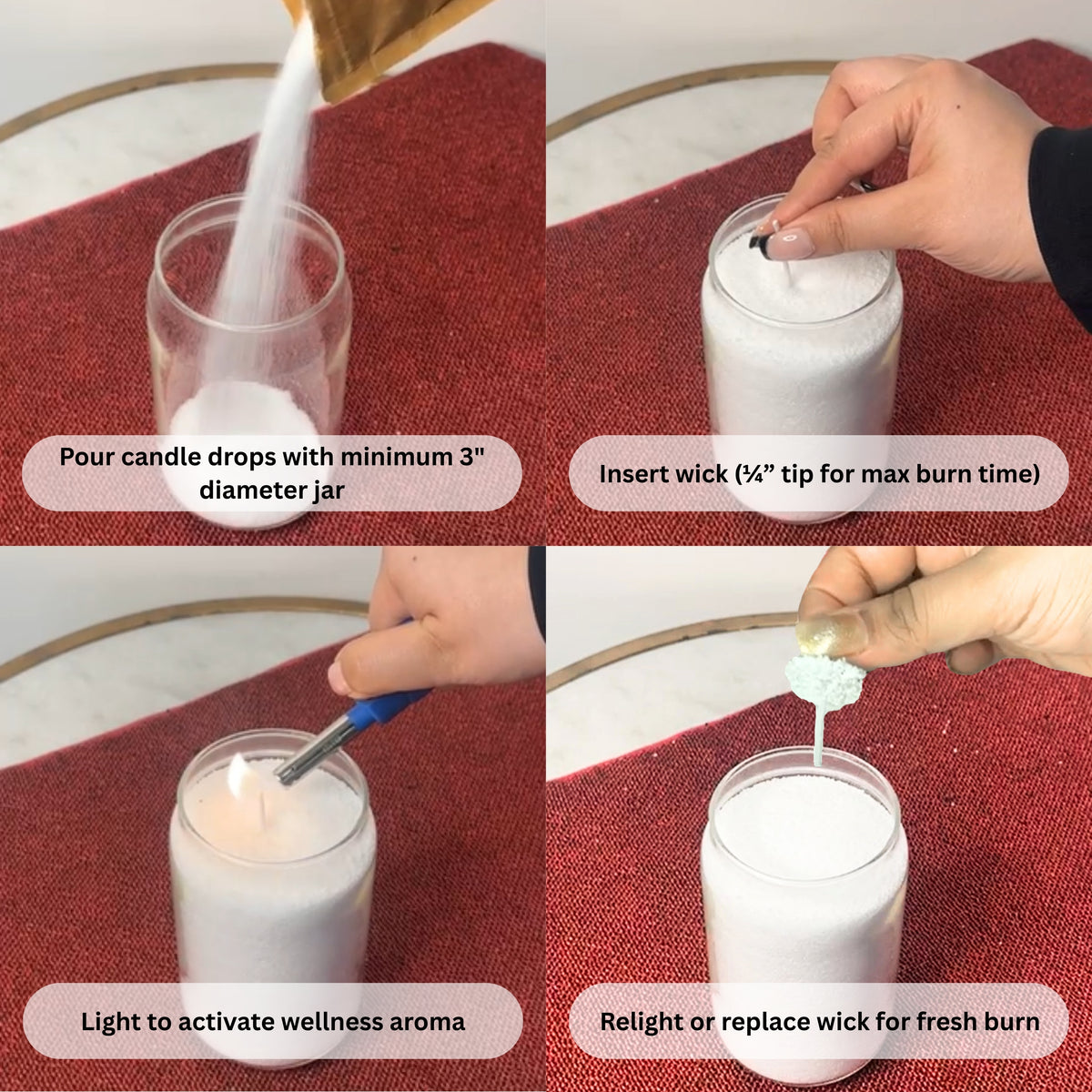 Unlike traditional candles, Candle Drops are loose wax granules that you simply pour, insert a wick, and light. No uneven and wasted wax. Always looks fresh.